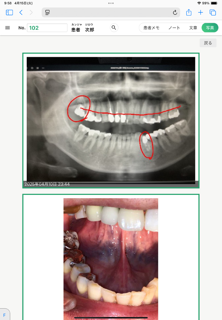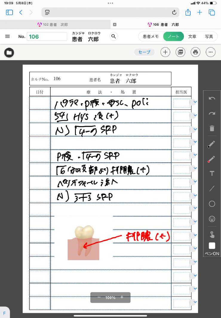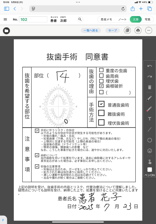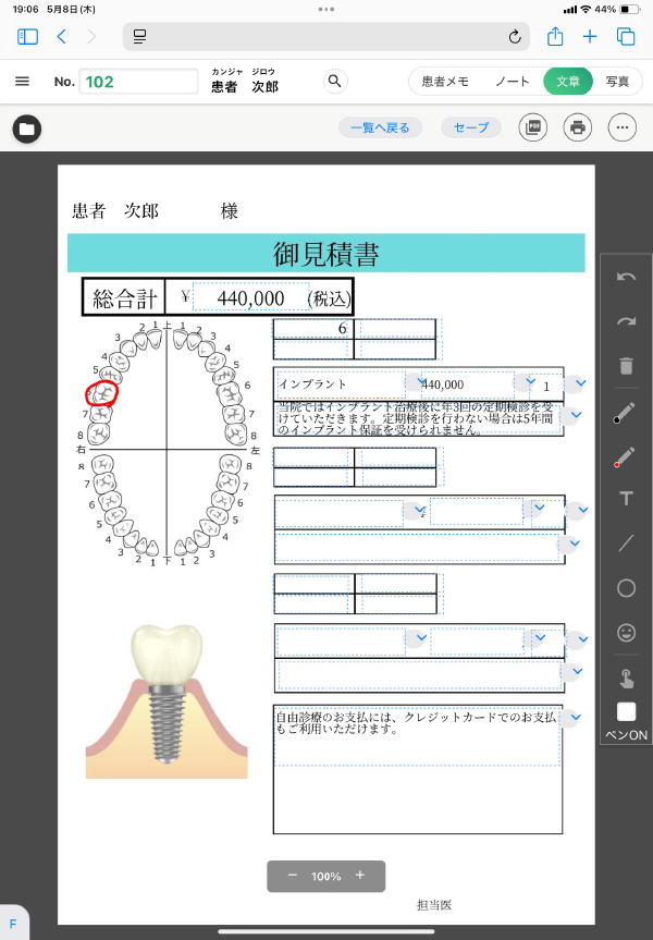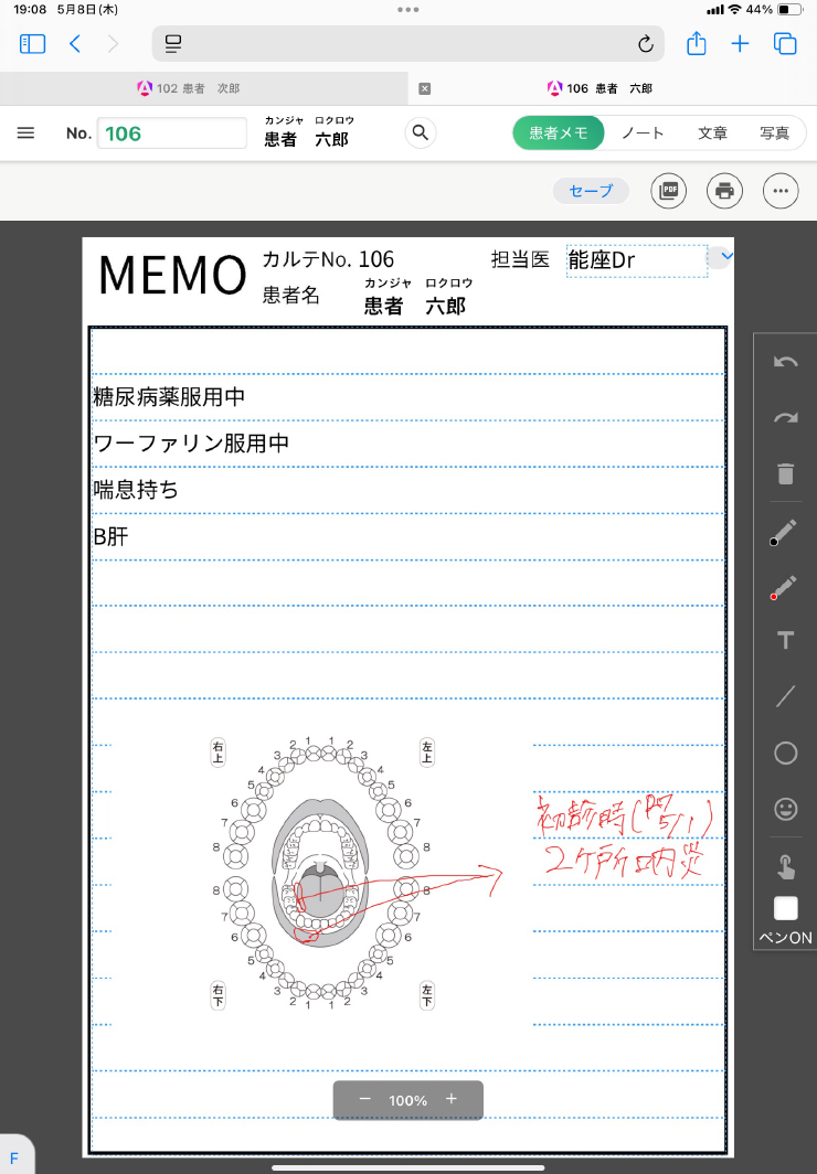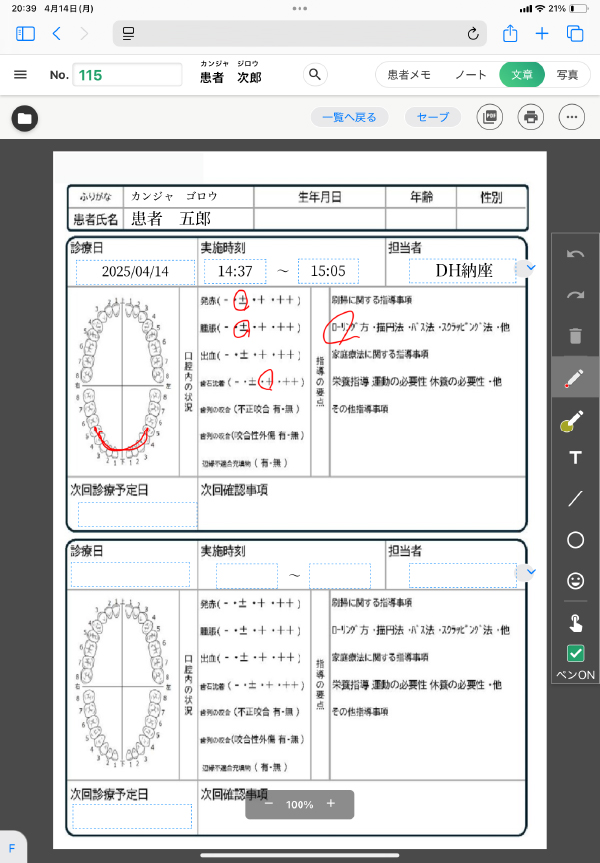 デンタルアーチ等の画像の用意もあり、手書きの書き込みもできます。