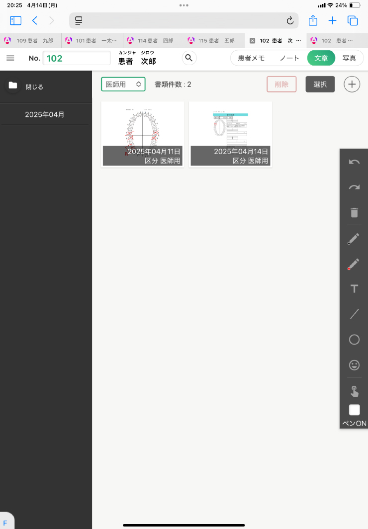 1患者につき、「患者メモ」「ノート」「文書」「写真」と4つの業務登録が可能です。