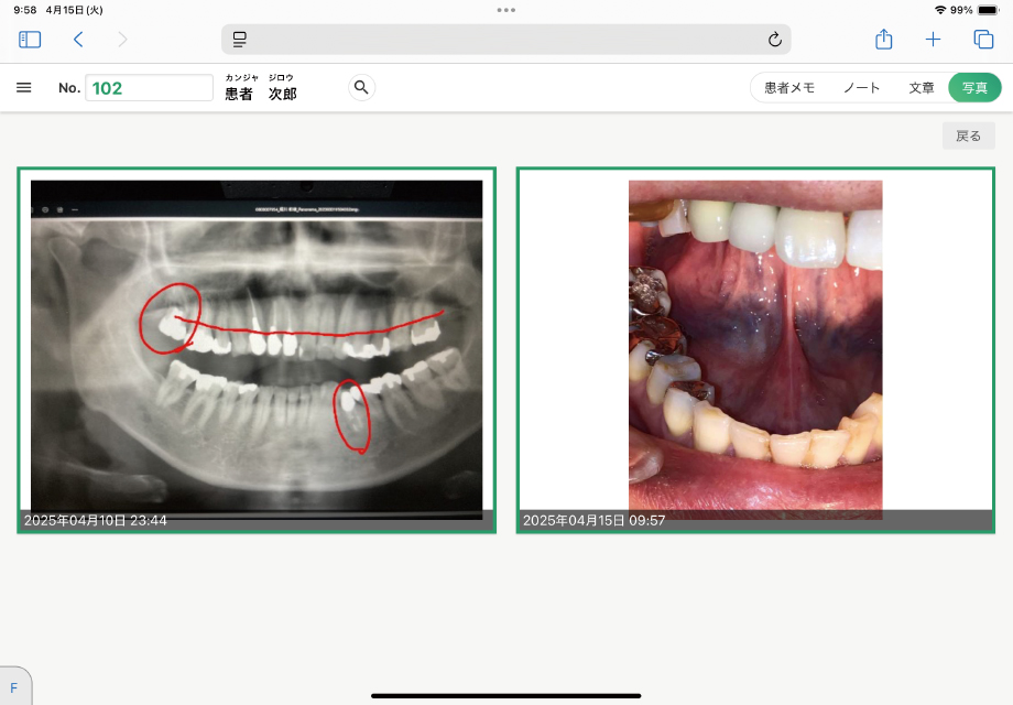 撮影した画像をグループに分けて保存が可能です。複数画像を縦に表示できるだけではなく、横でも表示可能です。撮った写真に書き込むこともできます。患者様が記入された書類を写真で管理できます。